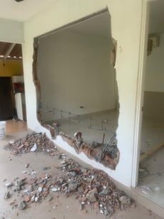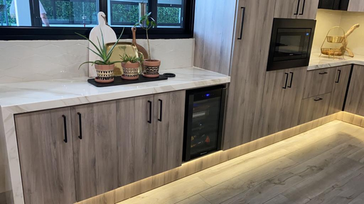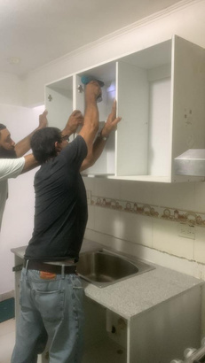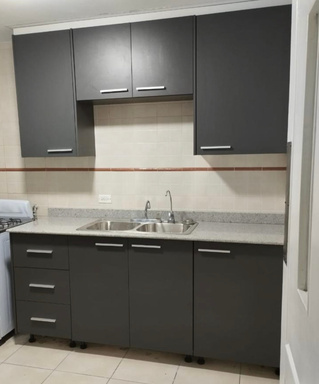 Renovación de cocina con muebles a medida, pisos, pintura e iluminación decorativa.